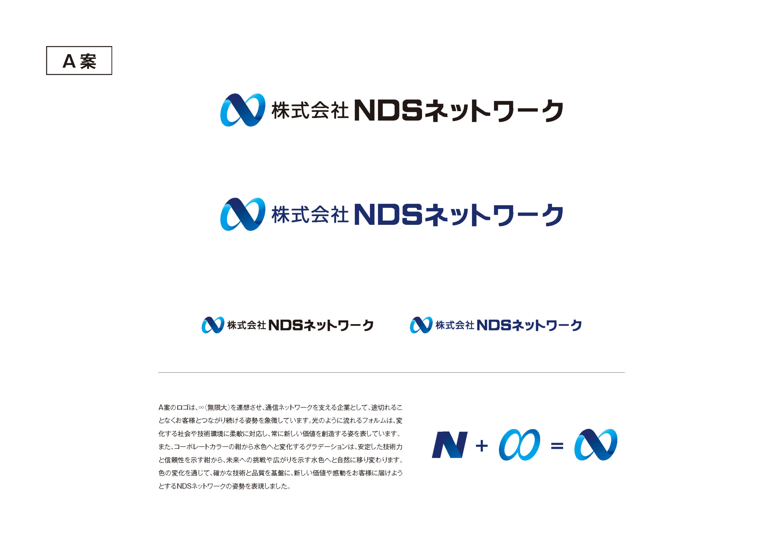 ロゴは、∞(無限大)を連想させ、通信ネットワークを支える企業として、途切れることなくお客様とつながり続ける姿勢を象徴しています。光のように流れるフォルムは、変化する社会や技術環境に柔軟に対応し、常に新しい価値を創造する姿を表しています。また、コーポレートカラーの紺から水色へと変化するグラデーションは、安定した技術力と信頼性を示す紺から、未来への挑戦や広がりを示す水色へと自然に移り変わります。色の変化を通じて、確かな技術と品質を基盤に、新しい価値や感動をお客様に届けようとするNDSネットワーク様の姿勢を表現しました。